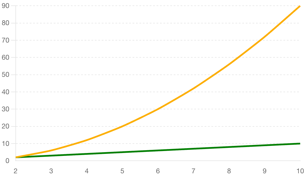 orange = connections with point to point systems (y = x*(x-1))