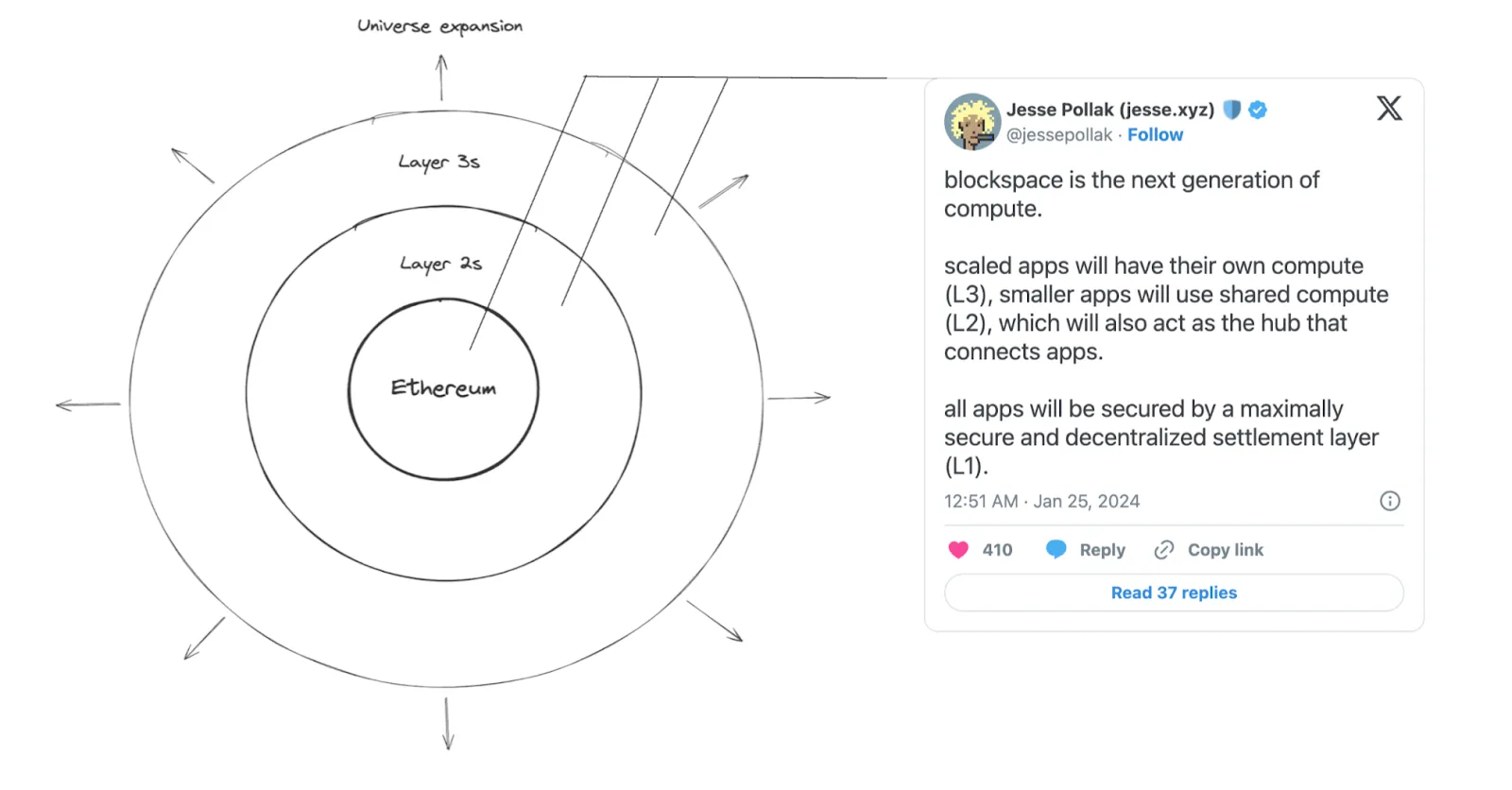 We are finally seeing a Cambrian explosion of the Ethereum ecosystem in real time with the growth coming in layers. The launch of Ethereum was the big bang establishing itself as the center of the universe. As the universe expands outwards, layers of rollups are forming rings around the center.