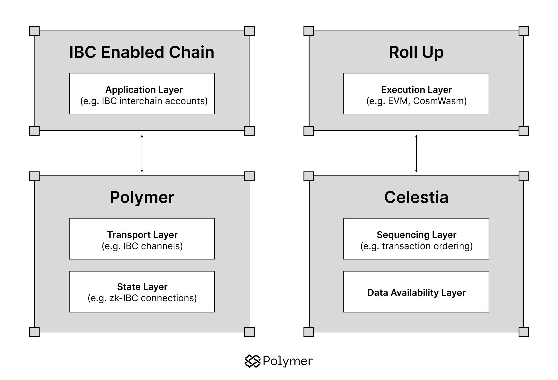 Polymer is building the first truly modular interoperability protocol that fully outsources the transport layer and partly outsources the state layer. As seen in the diagram below, the IBC transport layer runs on Polymer while the IBC app layer runs on the IBC enabled chain. With this design, enabling IBC on a new chain using Polymer is as easy as deploying a roll up onto Celestia. Polymer partly outsources the state layer by using zk-IBC connections to connect to newly IBC enabled chains while the zk verifier sits on chain (not shown in the diagram above for simplicity).
