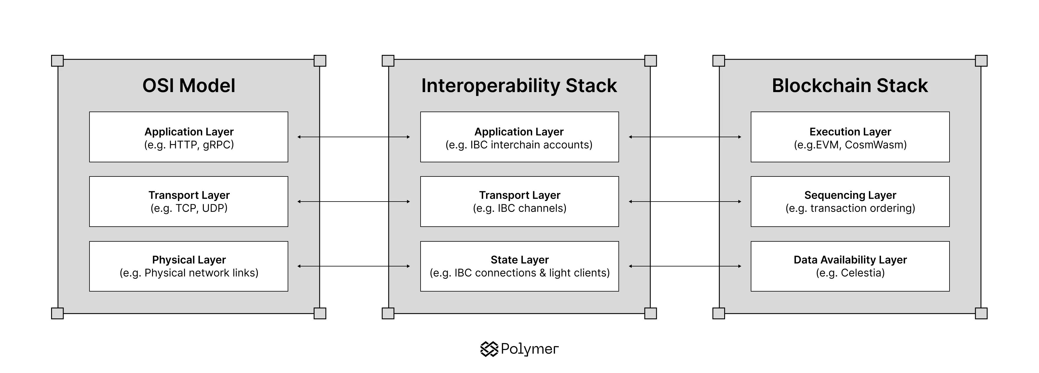 To relate the interoperability stack to existing concepts, we’ll use an imperfect analogy borrowing knowledge from the layers of a blockchain stack popularized by our friends at Celestia and the well understood OSI model.